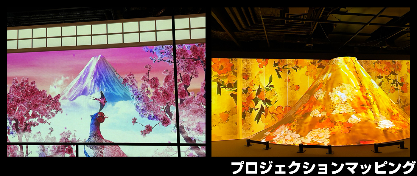展示のメインであるプロジェクションマッピングを使用し、壁やモニュメントに映し出される動く極彩色の浮世絵。